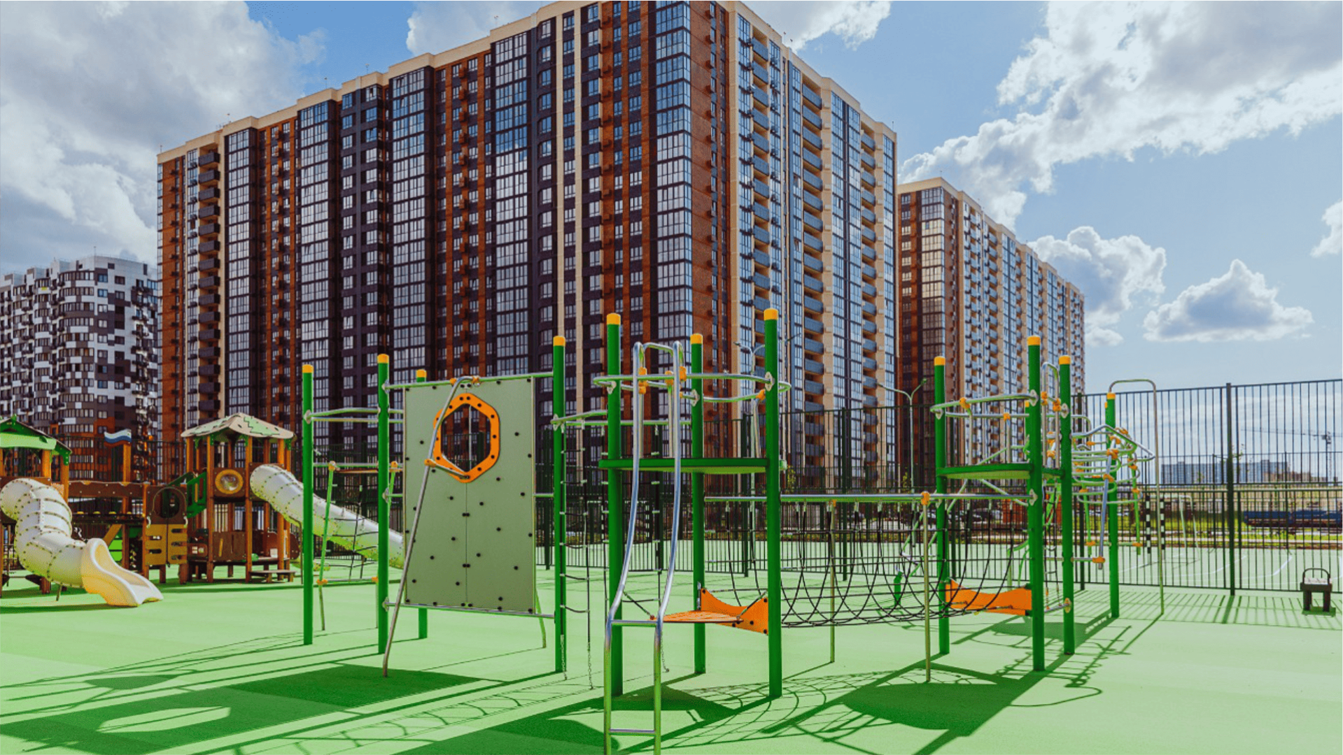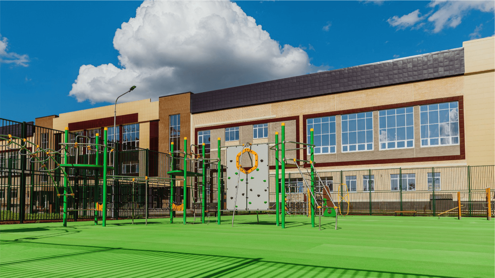 Дворовая территория обустроена спортивными универсальными площадками: для волейбола, баскетбола и футбола, для занятий ОБЖ, оборудованы беговые дорожки вокруг основного стадиона, а также - зоны для подвижных игр и спокойного отдыха учеников разных возрастов.